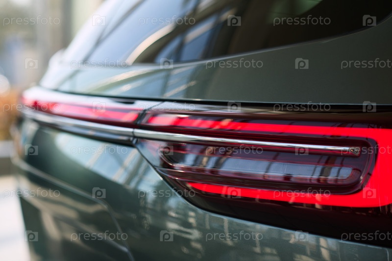 Клюзовый снимок, показывающий задние фонари современного автомобиля на автосалоне в помещении