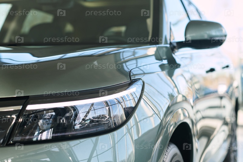 Ближайшее изображение современного автомобильного фар, отражающего солнечный свет внутри автосалона