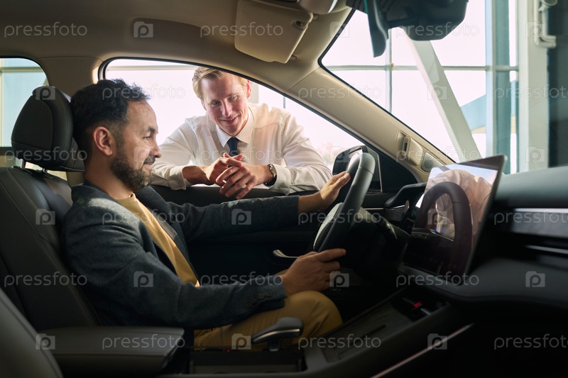 Продавец автомобилей помогает молодому взрослому ближневосточному мужчине выбирать транспортное средство