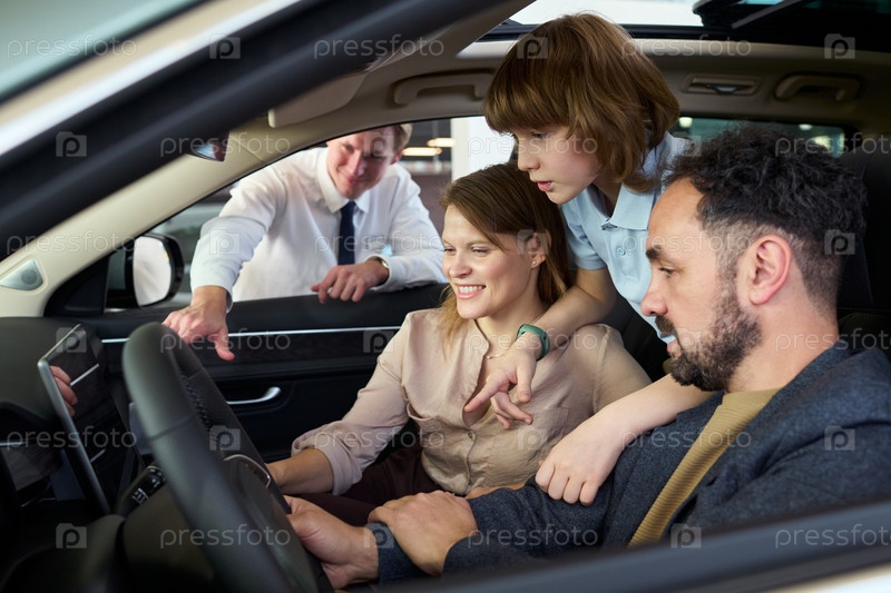 Семья консультирует продавца автомобилей во время исследования интерьера транспортного средства