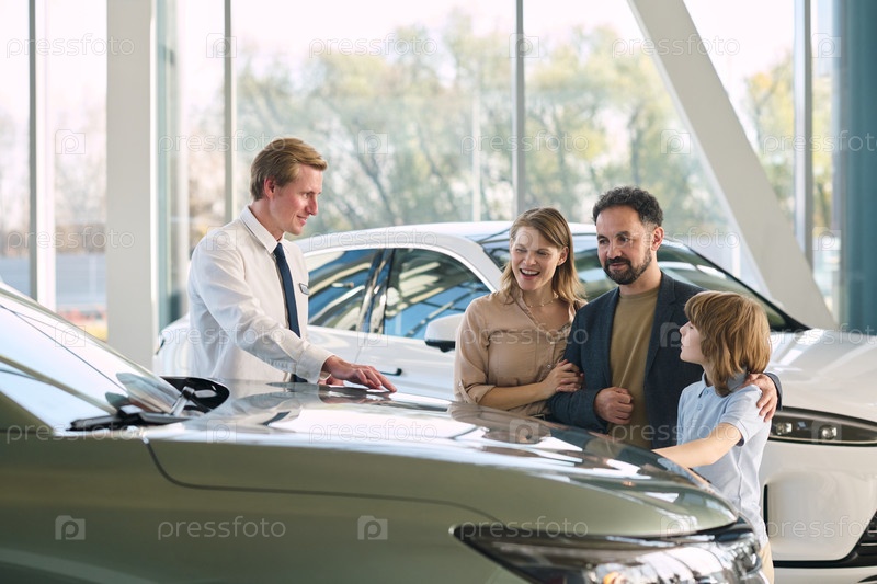 Автопродавец показывает автомобиль улыбающейся молодой семье в автосалоне