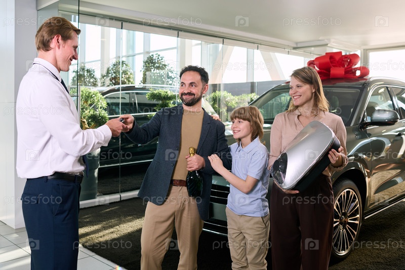 Продавец передает ключи от автомобиля улыбающейся многонациональной семье, которая празднует