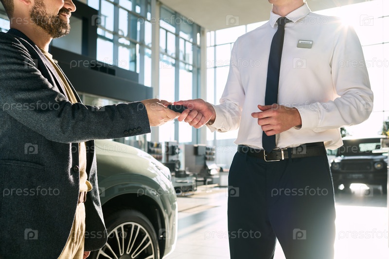 Молодой взрослый мужчина получает ключи от машины у молодого взрослого человека