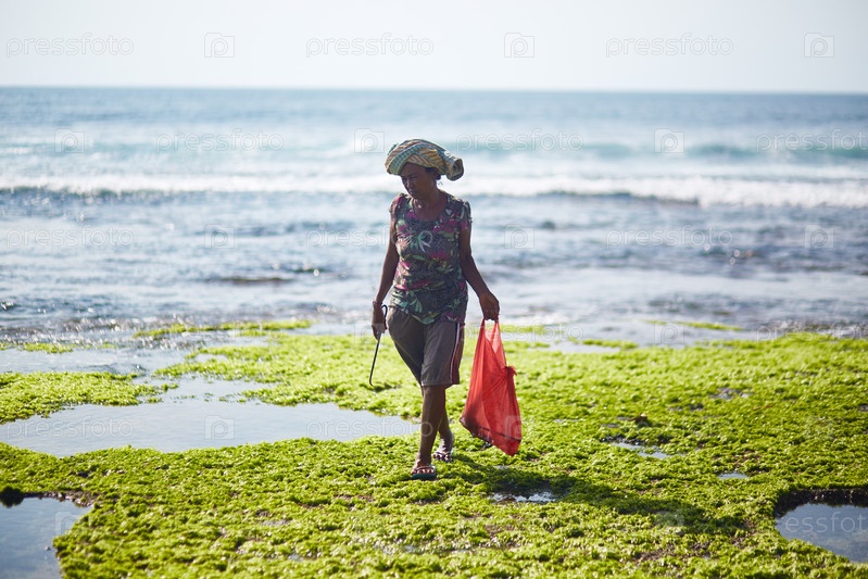 Чернокожая женщина среднего возраста собирает водоросли на прибрежной береговой линии в дневное время
