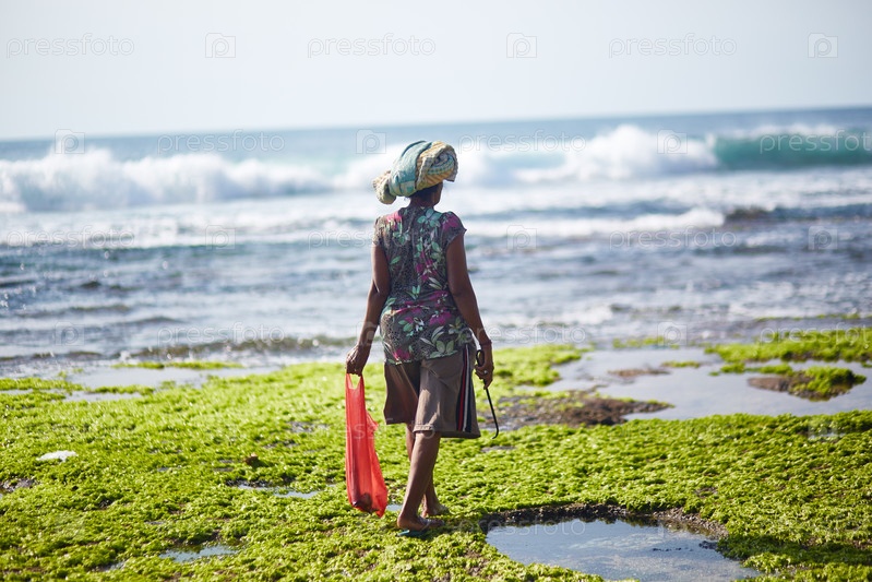Чернокожая женщина средних лет ходит вдоль скалистой береговой линии, неся сумку для покупок