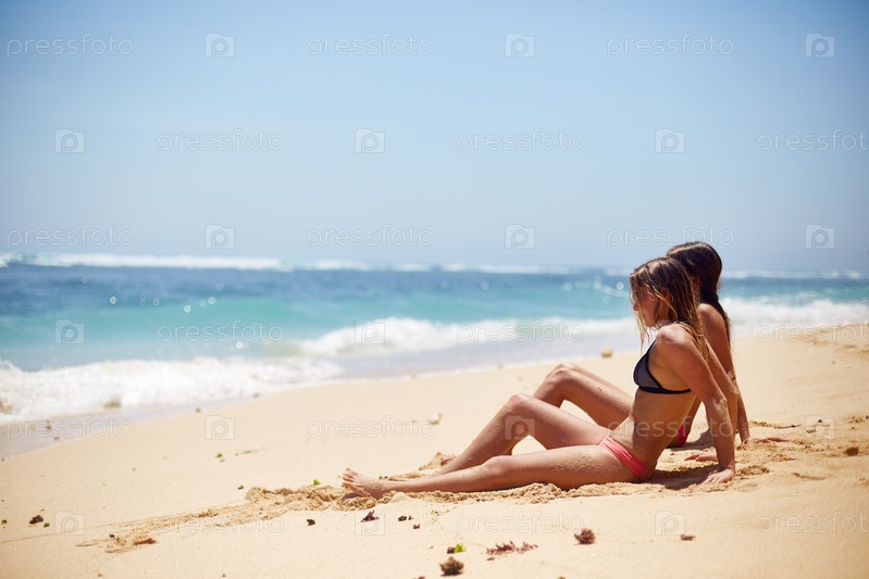 Молодые женщины расслабляются вместе на песчаном пляже недалеко от океана
