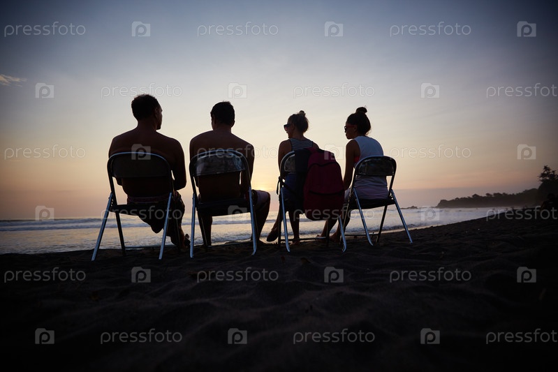 Группа молодых друзей, сидящих на пляже и смотрящих вместе закат