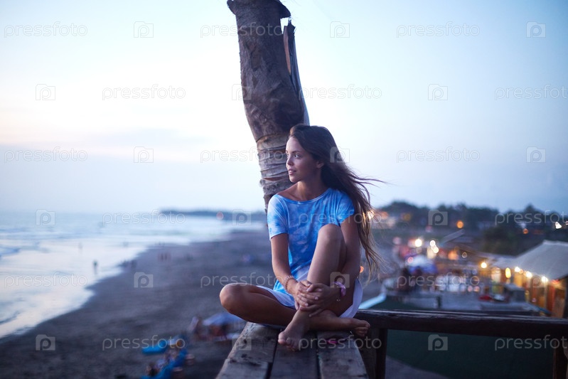 Молодая женщина сидит на деревянной платформе с видом на пляж в закате