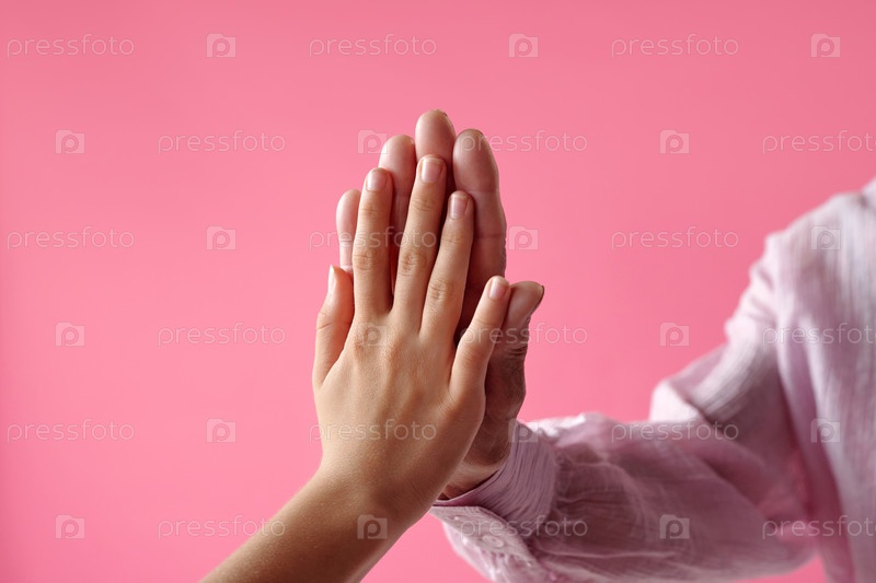 Молодая женщина и старший мужчина касаются друг друга руками на розовом фоне