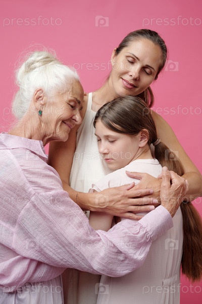 Старшая женщина обнимает женщину среднего возраста и девочку-подростка