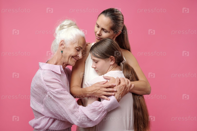 Старшая женщина обнимает молодую взрослую женщину и подростка