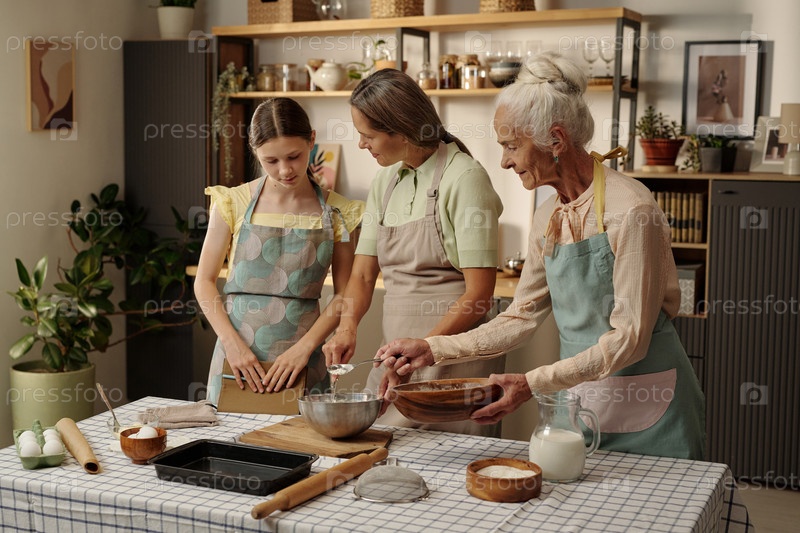 Девушка с матерью и старшей бабушкой пекутся вместе на кухне