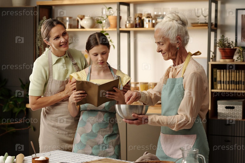 Старшая женщина учит молодую девушку и взрослую женщину печь вместе