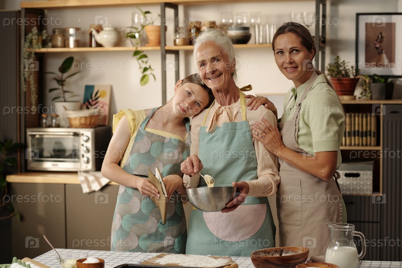 Старшая женщина выпекает с дочерьми среднего возраста и подростков