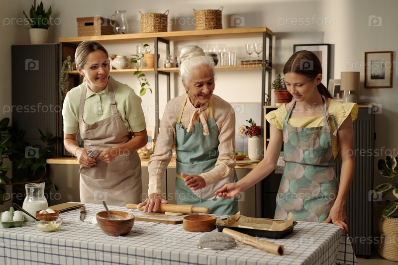 Старшая женщина учит молодых взрослых и подростков печь вместе