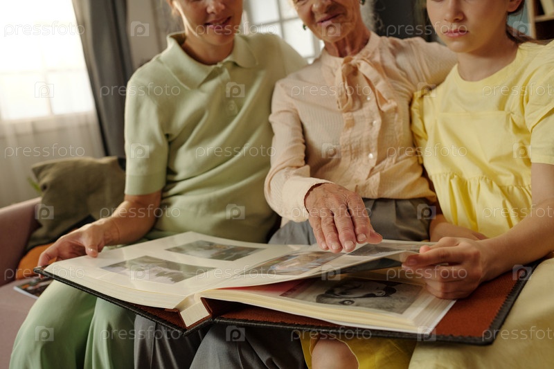 Старшая женщина делится семейным фотоальбомом с молодыми взрослыми и подростками