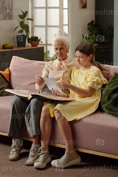Старшая женщина и девочка-подросток смотрят на фотографии вместе