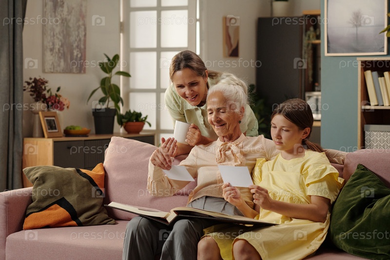 Пожилая женщина делится семейными воспоминаниями с молодыми взрослыми и подростками
