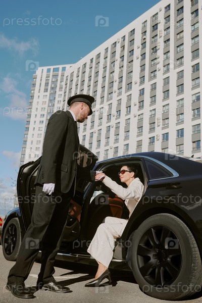 Шофер помогает женщине среднего возраста выйти из роскошного автомобиля