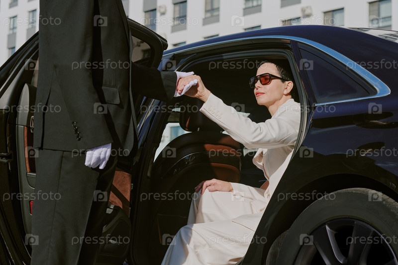 Женщина среднего возраста держит руку водителя, покидая роскошное транспортное средство