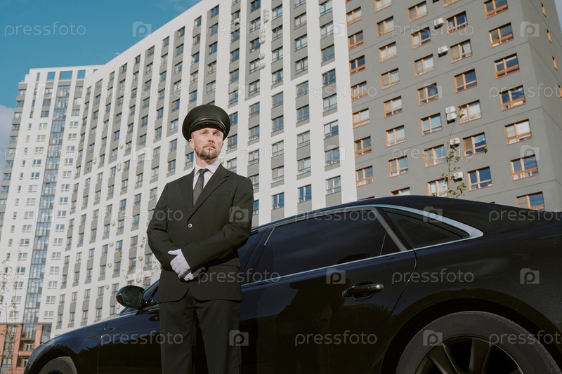 Молодой взрослый мужчина, стоящий на страже роскошного автомобиля возле современного здания