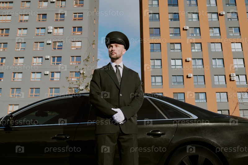 Молодой взрослый мужчина в униформе стоит рядом с автомобилем на улице