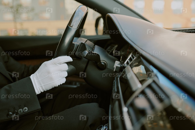 Мужчина среднего возраста, носящий перчатки, водящий роскошный автомобиль
