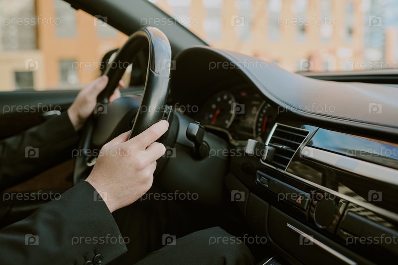 Молодой взрослый мужчина управляет автомобилем с руками на рулевом колесе