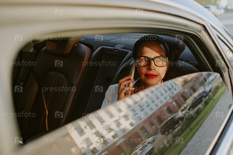 Портрет женщины среднего возраста, улыбающейся во время разговора по телефону в машине