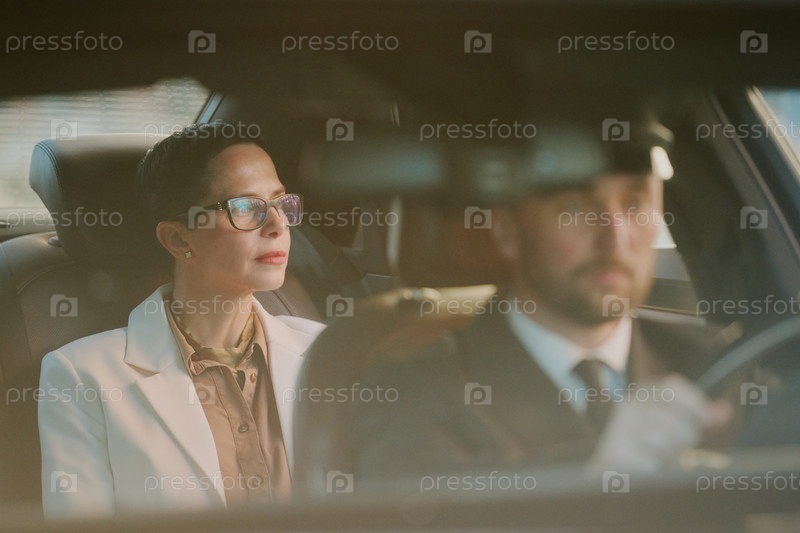 Женщина среднего возраста едет с шофером, который управляет роскошным автомобилем