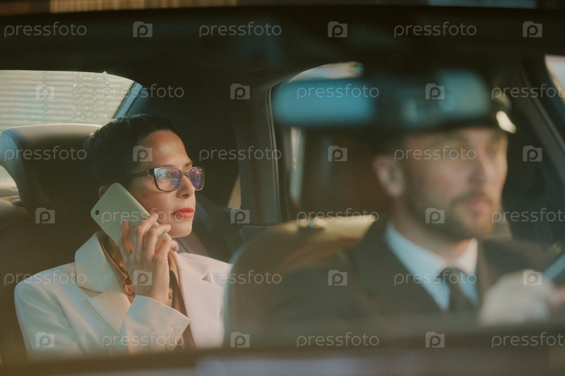 Женщина среднего возраста держит смартфон во время езды с шофером