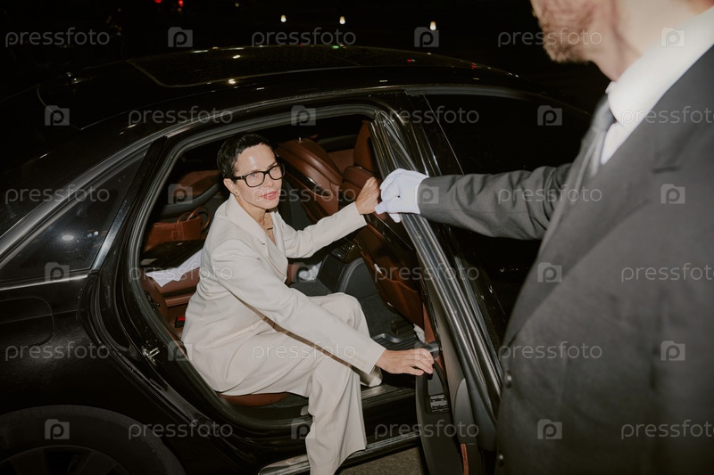 Молодая взрослая женщина выходит из машины с помощью шофера ночью