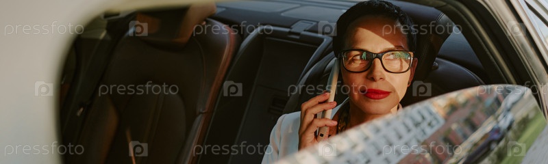 Женщина средних лет разговаривает со смартфоном, сидя в машине
