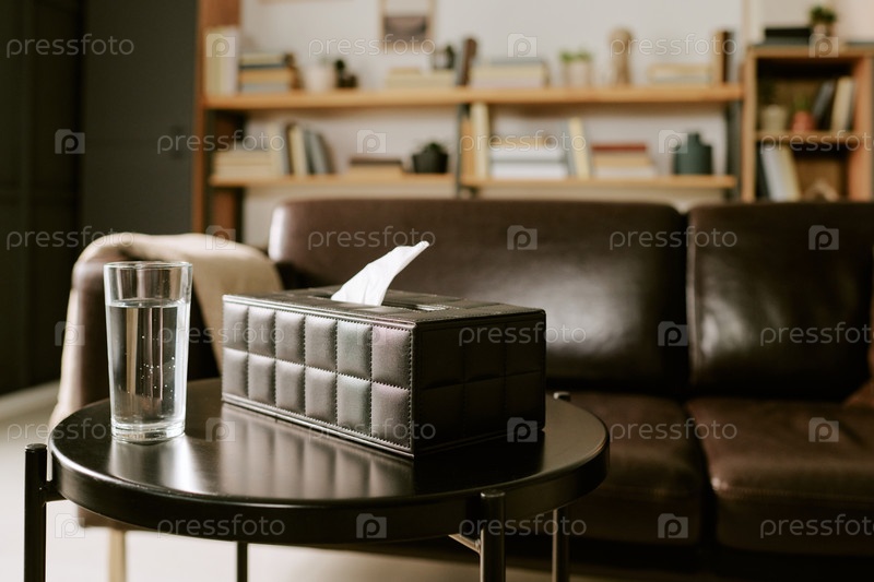 Психология Офисный стол, отображающий коробку с тканями и стакан воды в фокусе