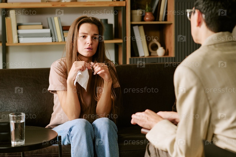 Молодая женщина обсуждает эмоции с терапевтом во время консультационного сеанса
