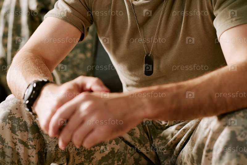 Молодой взрослый мужчина сидит в военной форме, размышляя об эмоциях