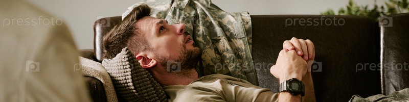 Молодой взрослый мужчина лежит на диване, отражая во время сеанса терапии