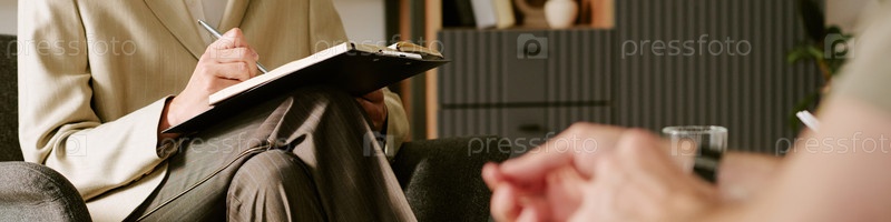 Непризнанная женщина-психолог делает заметки во время сеанса терапии