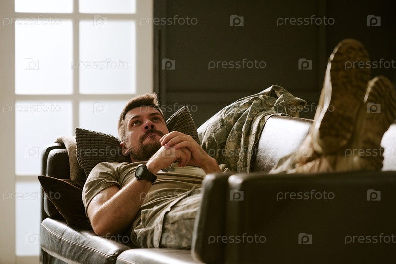 Молодой взрослый мужчина лежит на диване, размышляя о психологических проблемах