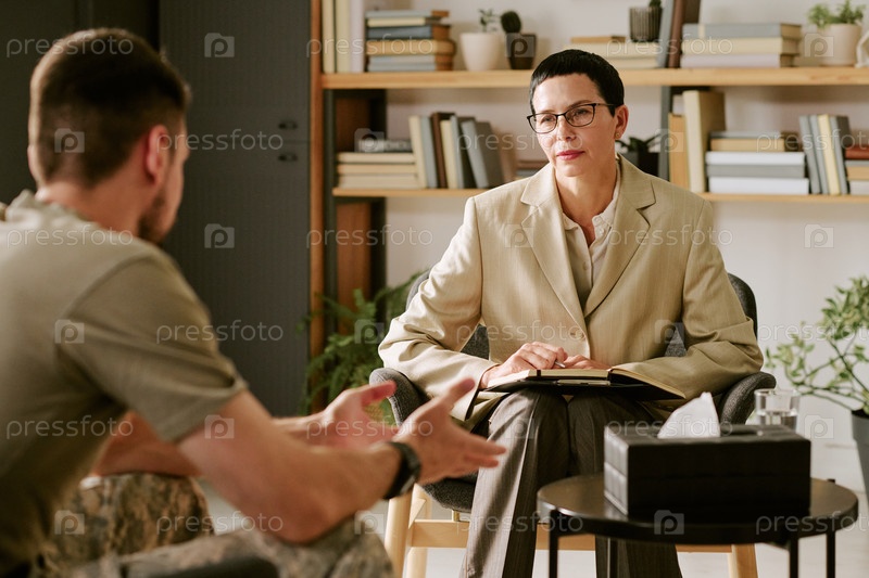 Женщина среднего возраста психолог слушает молодого взрослого мужчину, делящегося