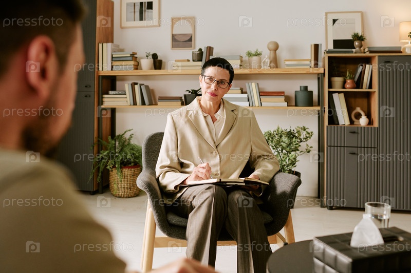 Психолог женщины среднего возраста слушает пациента во время сеанса терапии