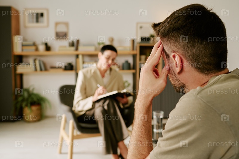Молодой человек консультирует женщину-психолога во время сеанса терапии