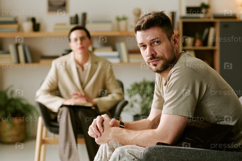 Портрет молодого взрослого мужчины, посещающего терапевтический сеанс с психологом