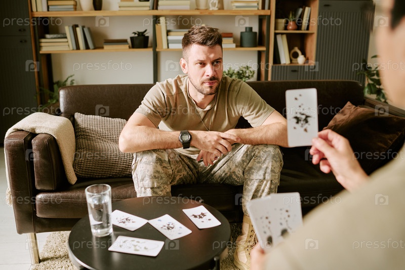 Молодой взрослый мужчина, участвующий в терапевтической карточной игре во время консультации