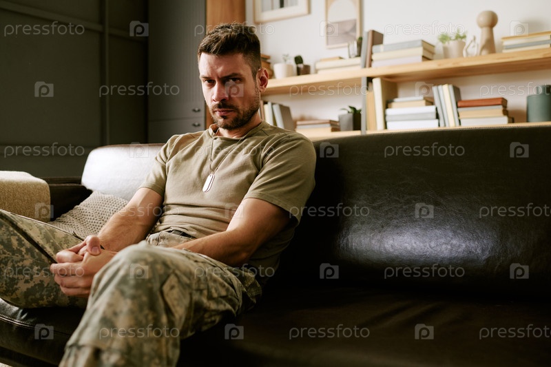Портрет молодого взрослого мужчины, сидящего на диване и размышляющего об эмоциях