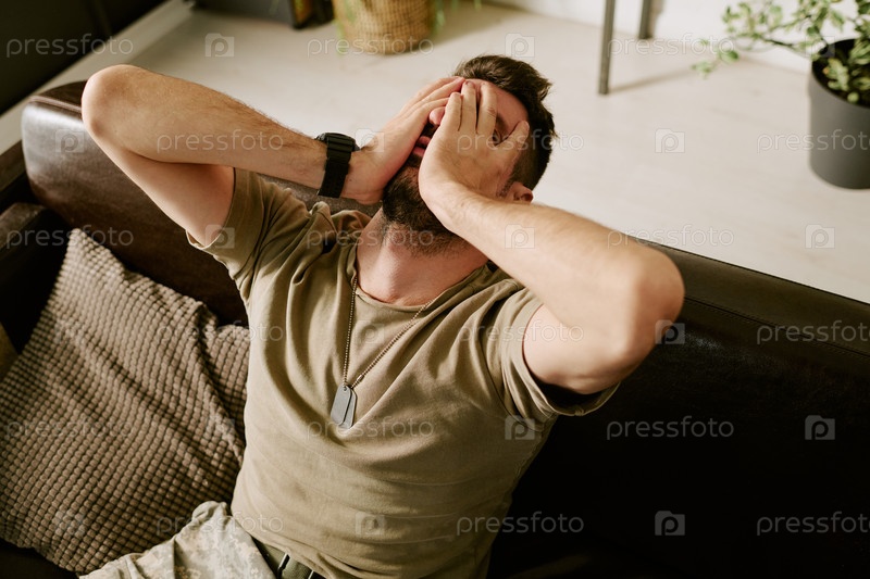 Молодой взрослый мужчина, сидящий на диване и испытывающий эмоциональное расстройство