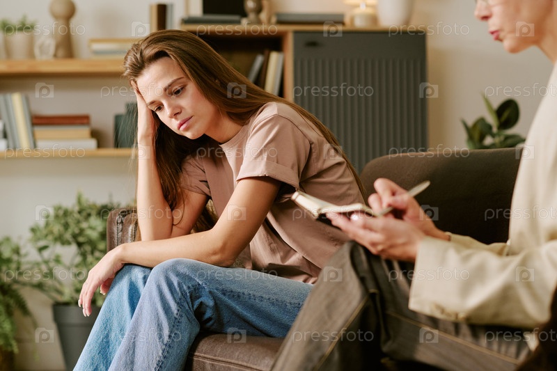 Молодая женщина сидит с терапевтом и обсуждает проблемы психического здоровья