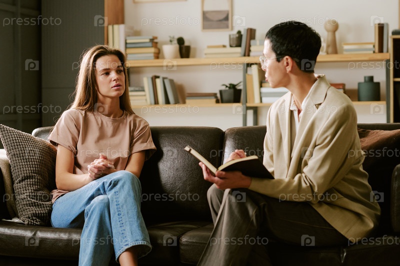 Молодая женщина обсуждает личные проблемы с мужским психологом в помещении