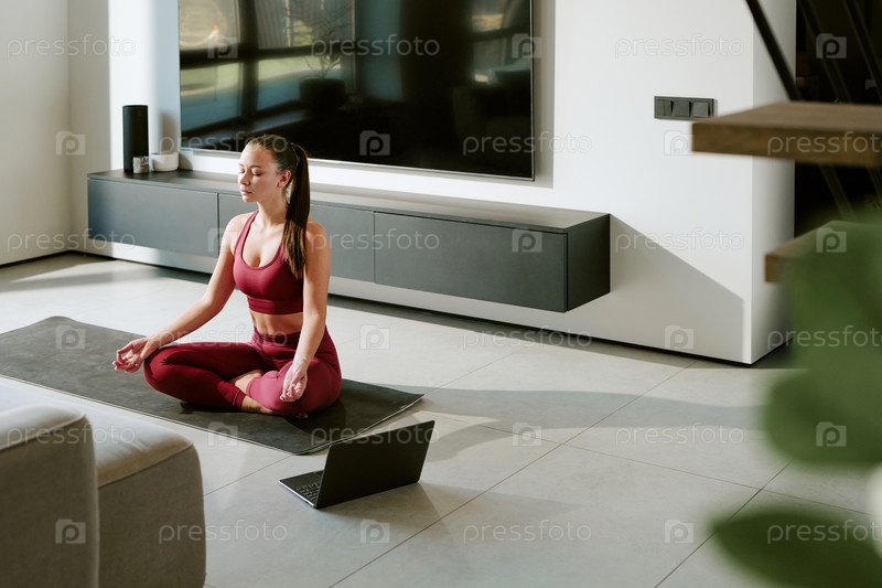 Молодая женщина медитирует на йога-матке во время мирной утренней рутины