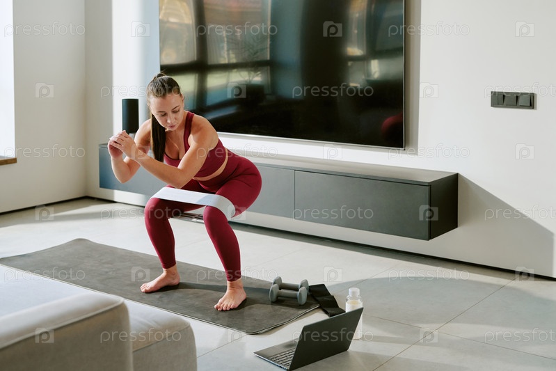 Молодая женщина тренируется с группой сопротивления во время утренней тренировки